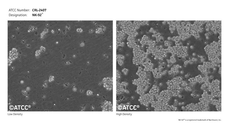 NK-92(Natural killer-92 cells)是一种永生化的自然杀伤细胞,最初是从一位50岁男性患者的外周血中分离而来,他患有急性非霍奇金淋巴瘤—一种起源于淋巴组织的恶性肿瘤,由发现该疾病的医师“托马斯·霍奇金”的姓氏命名。细胞悬浮生长,呈现聚团状。